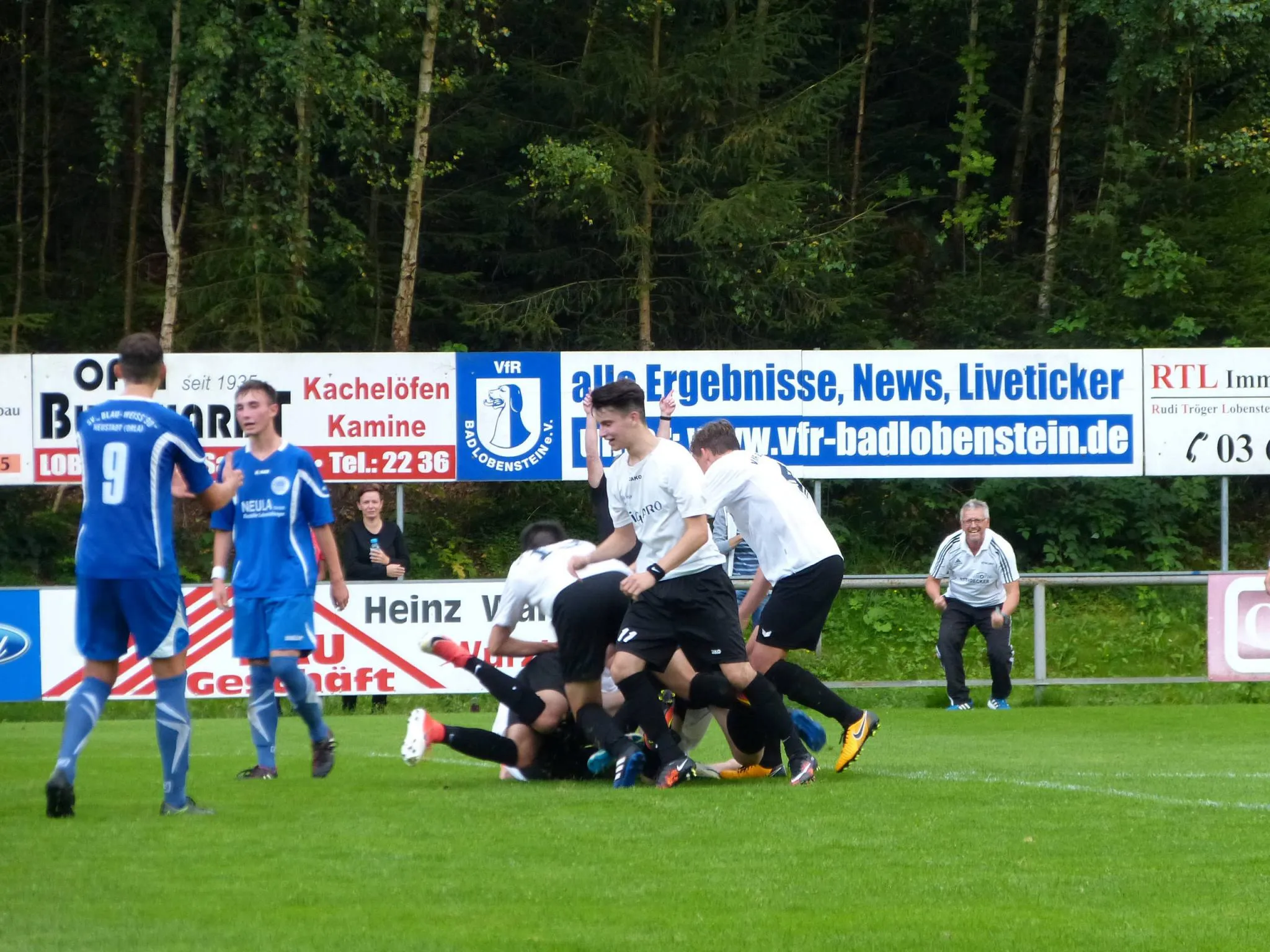 Die Spielgemeinschaft gewann hochverdient gegen die Verbandsligisten Neustadt 5:3. Bei super äußeren Bedingungen, dazu ein klasse Schirigespann um Rene Richter begann das Spiel bei hohen Tempo. Erst hielt Keeper Jean Luc gegen Neustadts Besten, Moses Walther(3), dann strich Baers Schuss knapp über den Kasten. Nach 23 Minuten bediente Ernst Markus Baer , der keine Probleme hatte einzuschieben. Nach einem Sonntagsschuss am Freitagabend glichen die Gäste nach 38 Minuten aus. Unbeirrt und des größeren Siegeswissen ging die Heimmannschaft durch den starken Wenzel wieder in Führung. (43). Nach der Pause das gleiche Bild . Hohes Tempo von beiden Mannschaften , aber die spielerische Linie war eindeutig bei den Gastgebern zu sehn . Zuerst ging ein Knaller von Ernst daneben , dann wurde einer der wenigen Fehler der SG Hintermannschaft eiskalt bestraft als Walther den Ausgleich markierte. (50)In dieser Phase hatten die Einheimischen etwas Glück des Tüchtigen. Nach 65 Minuten wurde die SG wieder stärker und fand zu ihren alten Kombinationsspiel . Folgerichtig gelang Baer mit einen Hinterhaltsschuss die wiederholte Führung(67). Das die Gäste das höherklassige Team sind ,sahen die Zuschauer in keiner Phase des Spiels. Mit langen Bällen hatte die gut organisierte Abwehr um Oefner meistens leichtes Spiel. Anders die Gastgeber , die nach super Zuspiel von Gössinger auf Ernst die Entscheidung nach 79 Minuten brachte. Zwar gelang Walther in der Nachspielzeit der Anschlusstreffer , doch Gössinger stellte den alten Abstand wieder her und besiegelte die Niederlage der Blau- Weißen.