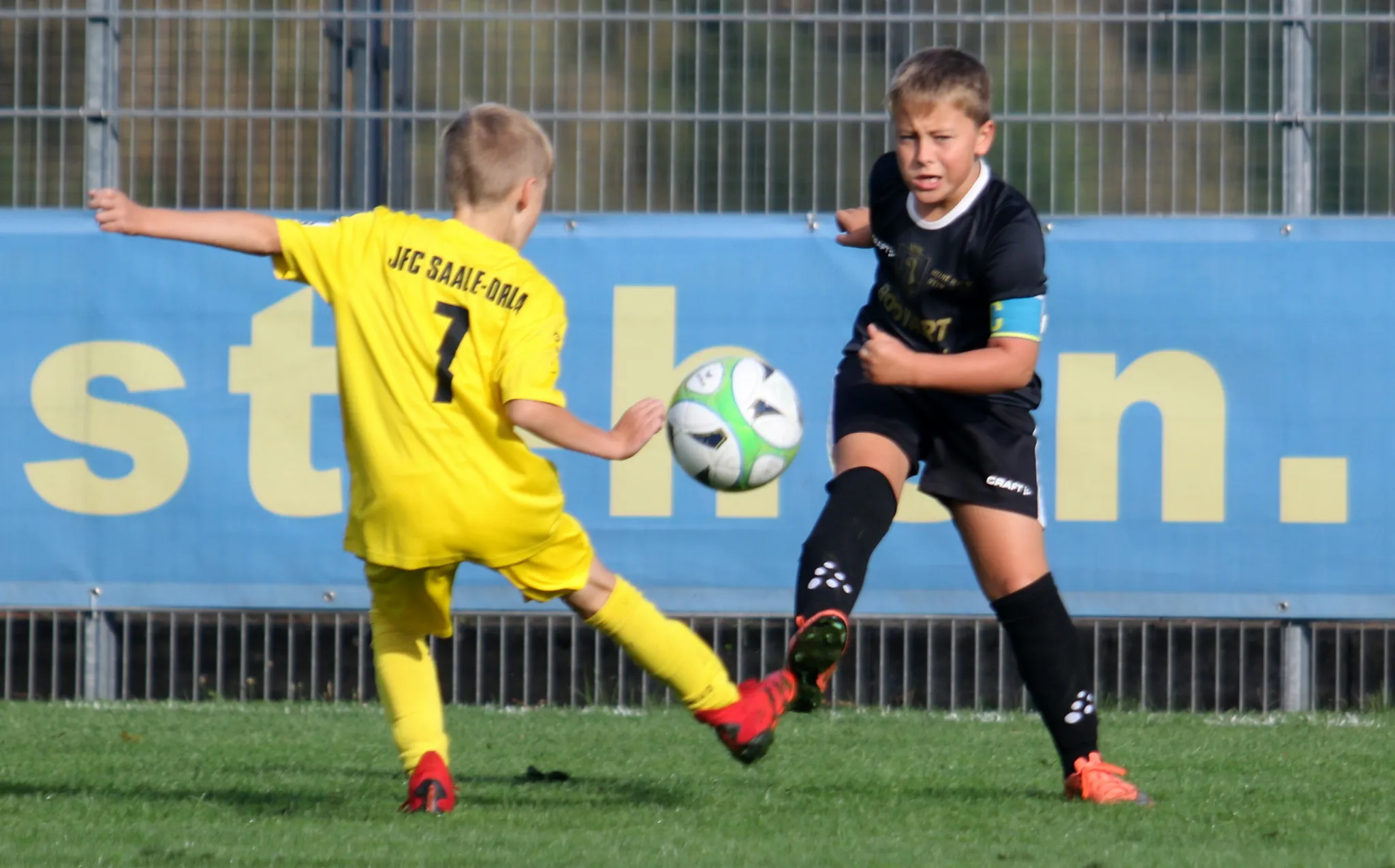 Nach dem hohen Sieg am Dienstag im Derby gegen Rosenthal ging es heute nach Pößneck zum Auswärtsduell beim JFC II. Auf dem traumhaften Rasen im Stadion "An der Warte" und bei bestem Fußballwetter wollten wir unbedingt den von uns ergatterten Platz 1 in der Tabelle verteidigen. Von Anfang an merkte man, dass uns hier ein anderer bzw. spielerisch stärkerer Gegner als vor 4 Tagen gegenüberstand. Trotzdem gelang es uns, recht schnell 2 Tore zu schiessen, allerdings mit etwas Hilfe vom Gegner (0:1) bzw. Glück, da noch leicht abgefälscht (0:2). In der 11. Minute musste dann Gabriel sein ganzes Können zeigen, indem er mit einer super Parade einen Schuss des Gegners abwehrte und so den Anschlusstreffer verhinderte. Das spornte uns nur noch mehr an und wir konnten kurz darauf noch 2 Tore erzielen. Dass es mit 0:4 in die Pause ging, war wiederum Gabriel zu verdanken, der aufmerksam blieb und den nächsten gefährlichen Schuss des JFC-Stürmers abwehren konnte. Auch ein kurz danach aus aussichtsreicher Position getretener Freistoß der Heimmannschaft ging zum Glück für uns knapp über die Torlatte. In der Halbzeitansprache mahnten die Trainer weiterhin zu vollster Konzentration und weiterhin ganzen Einsatz. Dieser Plan ging auf, wir erspielten uns weiter gute Chancen und ließen nach hinten nicht viel zu. Pech hatten dabei Karim und Hans, bei denen entweder die Latte oder der Pfosten im Weg standen. Doch konnten sich später auch beide noch in die Torschützenliste eintragen. Dann kam in der 48. Minute der Auftritt von unserem an dem Tag unüberwindbaren "Abwehrrecken" Aaron. In überragender Manier nahm er den alleine durchgebrochenen Stürmer des JFC in fairer Art und Weise den Ball ab und verhinderte somit wahrscheinlich das sichere Tor. Unser Ziel, auch in dieser Partie möglichst ohne Gegentreffer zu bleiben, wurde dadurch und natürlich durch eine starke mannschaftliche Geschlossenheit erreicht. Den Schlusspunkt setzte dann der an dem Tag das Team anführende Kapitän Louis mit einem unhaltbaren Traumtor aus 15 Metern in den Winkel zum 0:10 Endstand. Ein großer Dank geht an unseren immer fair spielenden Gegner, der sich trotz der vielen Gegentore nie hängenlies und uns jederzeit alles abverlangte. Mit diesem Sieg konnten wir souverän den "Platz an der Sonne" verteidigen und freuen uns auf kommenden Samstag und das Heimspiel im Koseltal gegen Moßbach.