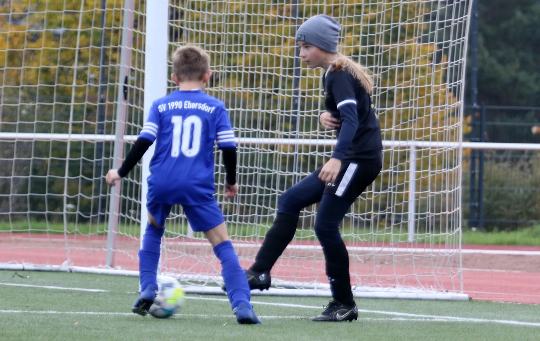Am heutigen Tag stand auf dem tollen Kunstrasenplatz in der Poststraße das mit Spannung erwartete Derby gegen die Kids des SV 1990 Ebersdorf auf dem Programm. Bestes Herbstfussballwetter und eine stattliche Zuschauerkulisse gaben diesem Spiel den verdienten Rahmen. Allen war klar, dass sich hier zwei Mannschaften auf Augenhöhe messen würden, auch wenn uns vor dem Spiel in der Tabelle 6 Punkte trennten. Dementsprechend konzentriert und motiviert gingen wir ins Spiel und erarbeiteten uns gleich viele Feldvorteile, die wir in einige Chancen und folglich auch in Tore umwandeln konnten. Jamie war es dann, der mit Unterstützung aller Mannschaftsteile und ebenso nach gekonnten Einzelaktionen, innerhalb von 9 Minuten einen lupenreinen Hattrick erzielte. Als dann noch Jule kurz darauf mit einer klasse Direktabnahme das 4:0 gelang, glaubten vielleicht einige schon an einen hohen und ungefährdeten Heimsieg. Doch die Kids des SVE kämpften sich Minute für Minute in das Spiel zurück, hielten richtig gut dagegen und zeigten des öfteren, was sie fussballerisch drauf haben. So ging es dann mit dem 4:0 zum Pausentee. Die Trainer warnten davor, auch nur ein paar Prozent nachzulassen und zu denken, das Spiel wäre schon entschieden. Das dies nicht unbegründet war, zeigte sich dann gleich vom Anpfiff an. Die Ebersdorfer riefen nun ihr ganzes Leistungsvermögen ab, ließen viel weniger Chancen von uns zu und erzielten mit einem Freistoß der Marke "Traumtor in den Winkel" den verdienten Anschlusstreffer. Dieser "Hallo-Wach-Effekt" sorgte dann dafür, dass wir wieder einen Zahn zulegten, mehr miteinander Fußball spielten und bis zum Schluss kein weiteres Gegentor zuliesen. So steht am Ende unter dem Strich ein letztdendlich verdienter Derbysieg gegen eine, vor allem in der zweiten Halbzeit, sehr gute und faire Mannschaft aus Ebersdorf. Diesen Sieg widmet die gesamte Mannschaft unserer Nummer 8 - Hans, der sich leider in der vergangenen Woche verletzte und längere Zeit ausfällt. Komm bitte schnell wieder auf die Beine, das Team braucht Dich !!! Am kommenden Samstag erwarten wir in einem weiteren Heimspiel die Kids vom SV Blau-Weiß-Neustadt II auf dem Kunstrasen, ehe es dann in die wohlverdienten Herbstferien geht.
