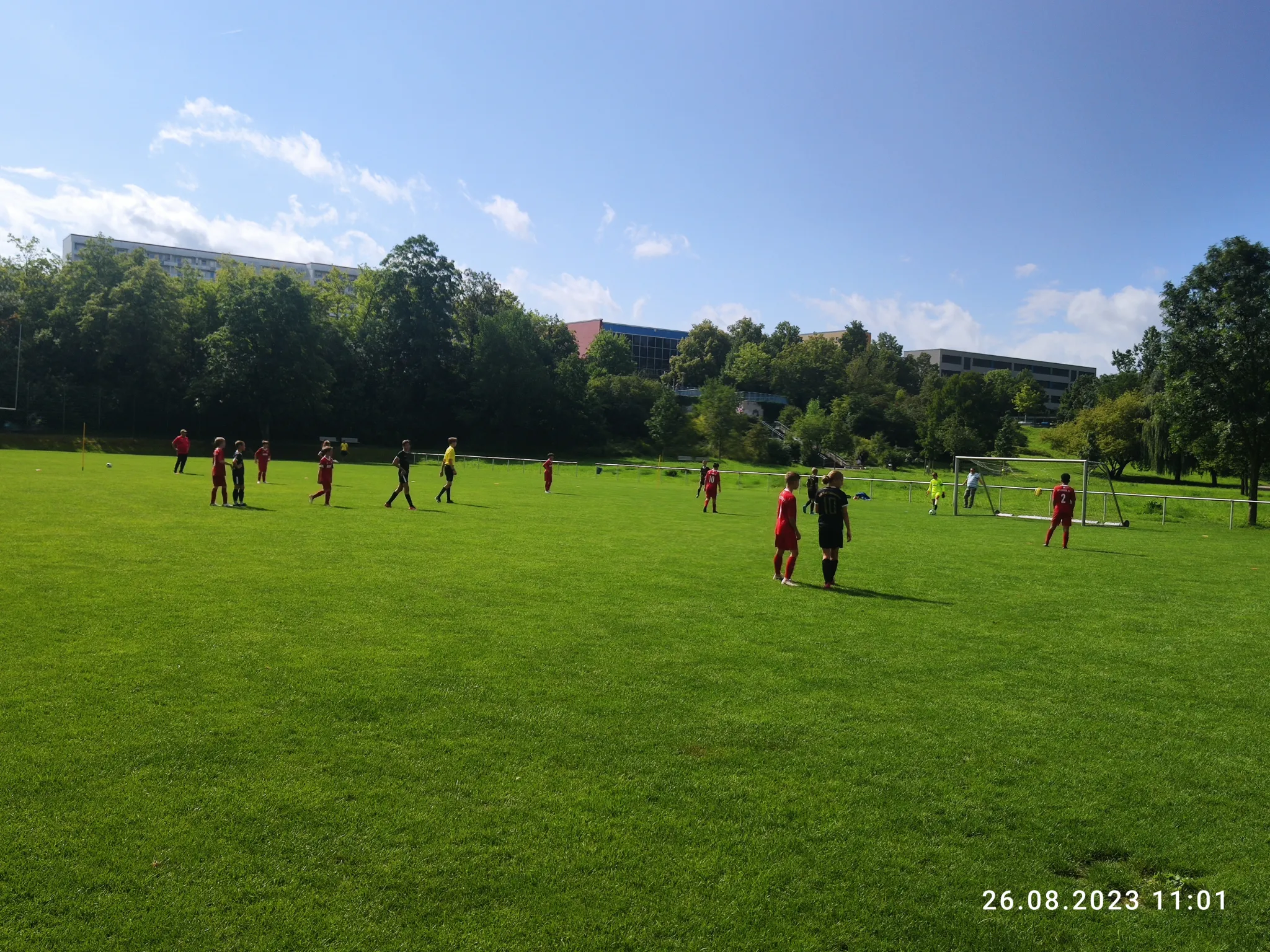 Nachdem die DII bereits am Donnerstag mit einer unglücklichen Niederlage im Derby in Remptendorf in die Saison startete, ging es heute für die DI erstmals in der Kreisoberliga auf Punktejagd. Zum Auswärtsspiel in Jena erwarteten uns die Kids des SV 77 Lobeda. Und was es bedeutet, in der Kreisoberliga anzutreten, merkten wir gleich von Anpfiff an. Alles etwas schneller, technischer und auch athletischer als in der letzten Saison. Doch stellten sich heute die 9 Kids (leider hatten wir noch 2 kurzfristige Ausfälle zu verkraften) tapfer dieser Herausforderung. Lobeda übernahm gleich das Zepter und kombinierte sich wirklich gekonnt durch unsere Reihen. Ben musste direkt nach 3 Minuten sein ganzes Können aufbieten, indem er einen platzierten Fernschuss noch über die Latte lenken konnte. Doch im Gegenzug hat dann Jule das 0:1 auf den Fuß, doch auch der Lobedaer Keeper ist ein richtig guter und hält den Ball. Mit etwas Mithilfe von uns erzielt dann kurz darauf der SV 77 das 1:0. Doch wiederum gleich danach hat Jamie den Ausgleich auf dem Fuß, als er einen langen Ball von Ben aufnimmt und den Ball nur ganz knapp übers Gebälk jagt. Wir bleiben am Drücker und Jule hat kurz danach ihre zweite riesen Torchance, doch wieder ist der gegnerische Keeper der Sieger. In der 14. Minute spielt dann der Stürmer der Lobedaer seine ganze Cleverniss aus, stiehlt sich im Rücken unserer Abwehr davon, bekommt den Pass gekonnt durchgesteckt und verwandelt unhaltbar zum 2:0. Kurz darauf unterläuft uns dann leider auch noch ein unglückliches Eigentor zum 3:0. Danach bewart uns wiederum Ben mit einer super Parade vor einem weiteren Gegentor. Im Anschluss spielen sich Jamie und Leon mit einem klasse Doppelpass durch die Abwehr der Lobedaer, doch wieder ist der Keeper gerade noch so mit dem Fuß am Ball und lenkt den Schuss knapp zur Ecke. Ein Traumtor in den Winkel besiegelt dann den 4:0 Halbzeitstand. In der Halbzeit suchten wir uns erstmal ein schattiges Plätzchen und schnauften durch. Für die zweite Halbzeit hieß dann das Ziel, möglichst weiter Fußball zu spielen, uns nicht vom Spieltstand beeindrucken zu lassen und etwas konsequenter die Chancen zu nutzen. Doch auch die Lobedaer Kids hatten ihrem Trainer offenbar gut zugehört, denn sofort nach dem Wiederanpfiff kombinierten sie sich unwiderstehlich durch unsere Reihen und erzielten direkt das 5:0. Doch unsere Moral blieb ungebrochen. Mit allen Kräften, sowie spielerischen Mitteln, hielten wir weiterhin dagegen und ließen uns nicht hängen ! Und so erspielten wir uns auch wieder mehrere große Chancen für einen Anschlusstreffer. Die größte hatte Karim, der, nach Foul an ihm, einen 9-Meter über den gegnerischen Kasten jagte. Aber auch die Lobedaer erspielten sich mehrere Chancen und nutzten davon eine zum 6:0. Dass sie keine weiteren Treffer mehr erzielten, lag wieder einmal am bestens aufgelegten Ben im Tor. Kurz vor Schluss war es dann endlich soweit und Jamie war es vorbehalten, mit einem sicher verwandelten Hand-9-Meter den mehr als verdienten Ehrentreffer und das erste Tor für uns in der Kreisoberliga zu erzielen. Damit ist hoffentlich der Bann getroffen und wir nehmen die Leistung als Grundlage und Ansporn für die kommenden Spiele. Wenn wir es schaffen, einfache Fehler zu vermeiden und weiter fleißig trainieren, werden wir uns auch wieder für unseren Aufwand und die Anstrengungen belohnen !
