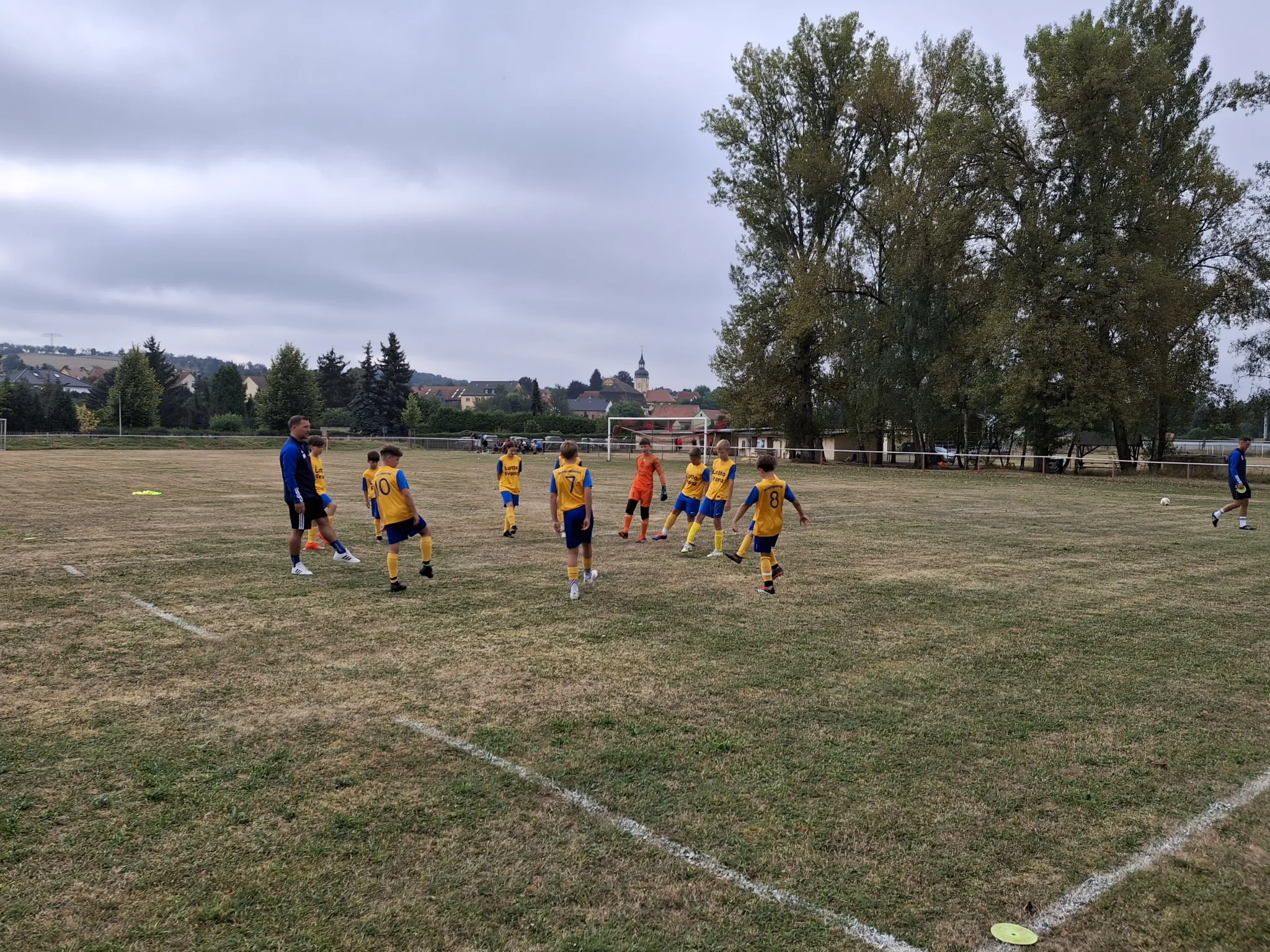 Am heutigen ("Wahl-") Sonntag führte die lange Reise der D1-Junioren des VfR nach Silbitz zu den Kids der SG SV Elstertal Silbitz/Crossen I. Auf dem etwas "gewöhnungsbedürftigen" (stark vertrockneter, teils sehr unebener Rasen) Geläuf versuchten wir von Anfang an unser gewohntes Passspiel aufzuziehen. Aber nicht nach einem Spielzug über mehrere Stationen, sondern "Kopfballungeheuer" Hans war es dann, der nach 2 Minuten den Torreigen mit einem Treffer aus der Luft eröffnete. Gut 10 Minuten später war es Jamie, der, ebenfalls per Kopf, die Führung ausbauen konnte. Unser Gegner hatte nicht viel dagegenzusetzen und probierte es hauptsächlich mit längeren Bällen oder Durchbrüchen durch die Mitte. Diese wurden aber zum größten Teil sichere Beute unserer Abwehr um Hannes, Jule und später Sunny. Über unsere unermüdlichen Antreiber Lenny und Louis, sowie die Aussenspieler Julian, Jamie und später Jannick wurden immer wieder gefährliche Angriffe in Richtung Silbitzer Tor vorgetragen. Auch unsere "Stoßstürmer" Hans und dann Luca, waren immer brandgefährlich. Zur Halbzeit stand bereits ein beruhigendes 0:3 auf der Anzeigetafel. In Anbetracht der Wärme und Platzbedingungen zeigten beide Teams einen tollen Einsatz und Willen. Unsere spielerische Überlegenheit konnten wir dann schließlich noch in 3 weitere Tore ummünzen. Ben, der an dem Tag nicht wirklich viel im Tor zu tun hatte, aber bei den wenigen gefährlichen Situationen immer auf dem Posten war, und die ganze Mannschaft konnten sich damit über das nächste "Zu Null Spiel" freuen. Mit diesem Auswärtsdreier sprangen wir vorerst wieder zurück auf Platz 1 in der Kreisoberliga, welchen wir möglichst in 2 Wochen (14.09.24) im Auswärtsspiel in Kahla verteidigen möchten.
