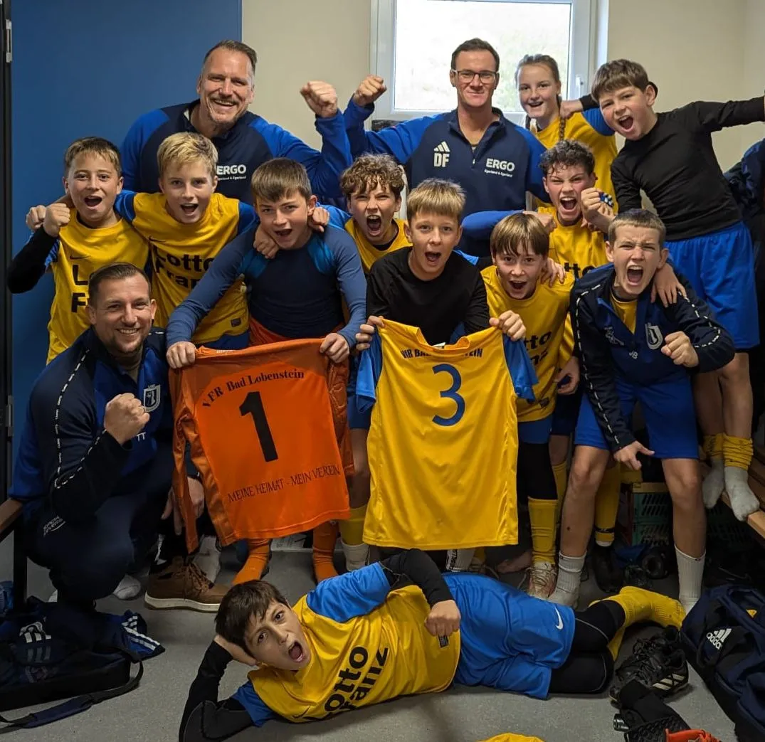 Am gestrigen Samstag führte die Reise der D-Junioren des VfR nach Jena zu einem weiteren Spitzenteam der Kreisoberliga, nämlich der U11 des FC Carl Zeiss. In den Vergleichen der vergangenen Jahre zog man bisher immer, teils ergebnistechnisch sehr deutlich, den Kürzeren. Mit einer dementsprechend eher etwas defensiveren Grundeinstellung gingen wir in die Partie auf dem toll präparierten Rasenplatz der Sportanlage "Oberaue". Wie erwartet, übernahm unser Gegner von Beginn an das Kommando und schaffte es immer wieder mit guten Kombinationen bis in die Nähe unseres Strafraumes. Spätestens dort war dann allerdings Schluß, denn unsere Taktik ging auf: wir machten die Räume eng, gingen energisch in die Zweikämpfe und schalteten nach Ballgewinn blitzschnell um. So setzten wir immer wieder gefährliche Nadelstiche, wovon einer durch Jamie zum vielumjubelten 0:1 verwertet werden konnte. Daruf reagierten die Kids aus der Saalestadt mit noch mehr Angriffspower. Bis zu Pause hatten wir Schwerstarbeit zu verrichten und auch etwas Glück, um den knappen Vorsprung in die Pause zu retten. In dieser mobilisierten wir alle Kräfte für die zweite Hälfte, denn wir spürten, dass heute hier etwas zu holen ist. In den zweiten 30 Minuten das gleiche Bild. Jena mit mehr Spielanteilen und der besseren Spielanlage. Wir mit Leidenschaft dagegenhaltend und immer wieder mit gefährlichen Kontern nach Ballgewinn. Minute für Minute verstrich und wir kamen unserem großen Ziel näher. Als Schlitzohr Louis 5 Minuten vor Schluss mit einem Fernschuss den Torhüter überlisten und das 0:2 erzielen konnte, wähnten sich schon manche auf der Siegerstraße. Doch postwendend der Anschlusstreffer nach einer tollen Kombination der Jenaer. Doch das konnte uns an diesem Tag nicht erschüttern. Mit einer wiederum stark gesetzten Gegenangriff nach Balleroberung war es dann Lenny vorbehalten, gekonnt gegen seinen "alten Verein " das 1:3 zu erzielen. Damit war die Moral unseres immer fair spielenden Gegners gebrochen und der erste Sieg gegen den FC Carl Zeis Jena perfekt ! Dementsprechend riesig der Jubel bei Spielern, mitgereisten Eltern und den Trainern über einen nicht alltäglichen Erfolg. Unseren Gegner wünschen wir weiterhin eine erfolgreiche Saison und freuen uns schon auf das Rückspiel in Bad Lobenstein.