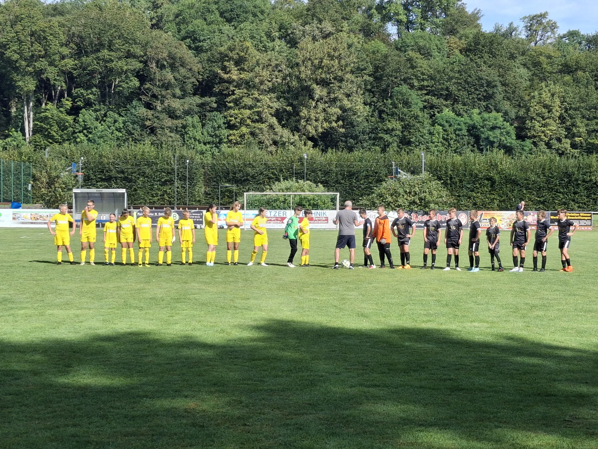 Am gestrigen Tag führte die Reise der DII Junioren des VfR nach Oppurg zum Kräftemessen mit dem Kids des JFC Saale-Orla II. Auf einem tollen Geläuf erwischten die Gastgeber den besseren Start und gingen bereits nach 2 Minuten mit einem abgefälschten Schuss in Führung. Auch danach hatte unser Gegner mehr Spielanteile, konnte diese aber erstmal nicht in Tore ummünzen. Im weiteren Spielverlauf kamen wir mehr und mehr besser ins Spiel. Nach gut 20 Minuten belohnten wir uns dann mit dem verdienten Ausgleich, welcher gleichzeitig den Halbzeitstand markierte. In den zweiten 30 Minuten entwickelte sich schließlich eine spannende Partie zwischen zwei ebenbürtigen Teams. Es ging hin und her, mit Chancen auf beiden Seiten. Ein tolle Freistoßvariante schloss dann Julian zum 1:2 ab. Die Kids des JFC ließ dies unbeeindruckt und kurz darauf den Ausgleich erzielen. Als alle schon mit einem Unentschieden rechneten, nahm sich Karim ein Herz und erzielte nach einer tollen Einzelleistung das vielumjubelte 2:3. Jetzt wähnten wir uns bereits auf der Siegerstraße. Es gab aber noch einmal Anstoß und mit einem satten Fernschuss gelang unserem Gegner doch noch der letzendlich auch verdiente Ausgleich. Abgesehen von der sehr guten Mannschaftsleistung aller VfR-Spieler an dem Tag, ist außerdem das "Pflichtspieldebüt" von Hektor im VfR-Dress zu erwähnen.