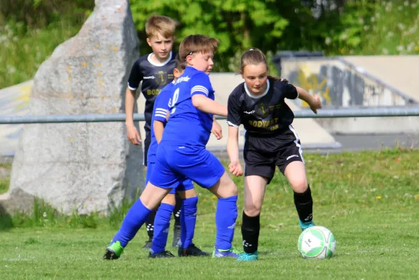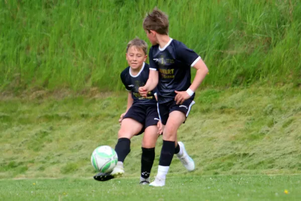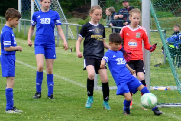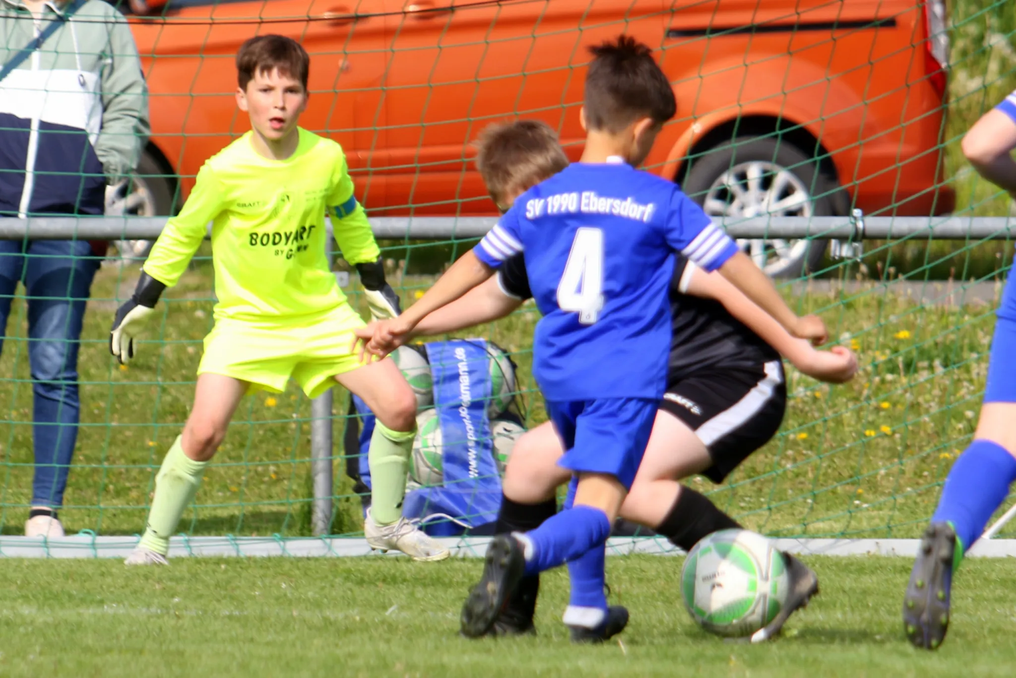Nach dem überzeugenden Heimsieg am vergangenen Wochenende gegen Schleiz und der damit "unter Dach und Fach" gebrachten Meisterschaft in der Kreisliga C, hies es heute "auf zum Derby nach Ebersdorf". Wir wollten hier einfach den Schwung aus dem letzten Heimspiel mitnehmen und an die tolle Leistung anknüpfen. Das gelang uns auch von der ersten Minute an und so "klingelte" es gleich 5 Mal im gegnerischen Kasten innerhalb der ersten 15 Minuten. Die Kids aus Ebersdorf mussten sich davon erstmal etwas erholen und schafften es dann auch, sich aus der "Umklammerung" zu befreien und in der 22. Minute einen eigenen Treffer zu erzielen. Doch kurz darauf stellte Jamie mit seinem zweiten Tor wieder den alten Abstand her. Hervorzuheben ist hier, dass sich insgesamt 4 verschiedene Spieler als Torschützen eintragen konnten und dass unsere Sunny ein wirklich klasse Kopfballtor nach einer Ecke von Louis erzielen konnte. Aufgrund von einigen Umstellungen bzw. Auswechlsungen auf Seiten des VfR, einer sehr starken Keeperin zwischen den Pfosten des SVE und auch durch eine Leisstungssteigerung unseres Gegners, blieb die zweite Halbzeit torlos und endete somit unentschieden. Auch der erstmals bei uns im Tor stehende (und Kapitän) Julian konnte mehrmals sein Können unter Beweis stellen. Schlussendlich steht dann unter dem Strich ein ungefährdeter "Auswärtsdreier" im Derby bei den sehr fair spielenden Kids des SVE. Wir wünschen Euch noch viel Erfolg in Euren letzten Saisonspielen, bis bald ! Ansonsten steht für uns am nächsten Samstag die Teilnahme beim Jubiläumspfingstturnier des TSV Gahma auf dem Programm. Hier starten wir beim Turnier der D-Junioren, was sicherlich einen schönen "Härtetest" und einen Ausblick auf die kommende Saison für unsere Kids bedeutet.