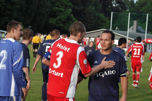 Wer geglaubt oder gar gehofft hatte, daß der VfR Bad Lobenstein beim Freundschaftspiel am Dienstag Abend gegen den FC Rot Weiß Erfurt das Spiel lange offen halten könnte, sah sich schon nach 15 Minuten eines besseren belehrt. Da führte der Gast aus der Landeshauptstadt nach Toren von Sarvan ( 5.), Kohlmann ( 12.) und Chamki ( 15.) klar mit 3 : 0. Die Mannschaft von Trainer Holger Leube wollte natürlich die Chance nutzen, eine so renomierte Mannschaft zu "bespielen", um so die eigenen Grenzen zu spüren. Die Gelegenheit, die die E-ON Thüringer Energie mit ihrer Möglichkeit der "Heimspiel2008" bietet, nötig schon Respekt und ein großes Dankeschön ab. Vorbild eigentlich auch für andere Vereine der künftigen 3. Liga, deren Fans leider mit sinnlosen Rufen die Gäste des VfR beleidigten und nicht verstanden, daß im Wort Freundschaftsspiel der Kern "Freundschaft" dominant ist. Nicht desto trotz änderte der VfR auch nach dem 3. Tor seine gewohnte offensive Grundeinstellung nicht und versuchte, mitzuspielen. Dies würdigen die 450 Zuschauer mit Applaus für gelungene Szenen. Eine Mauertaktik kam schon für die Einheimischen nicht in Frage, weil mit den verletzten Popp und Munzer und den beruflich verhinderten Michel und Linke gleich 4 Stammspieler fehlten. Vor allem das Fehlen der letztgenannten als eigentlich deffensive "Sechser" machte es den Gästen noch leichter, ihre einstudierten Wege zu gehen und ihre individuelle Klasse zu zeigen. So waren die Tore durch Chamki ( 25.), der eine Flanke von rechts einschob, und noch zweimal Sarvan (28./39.) Leckerbissen für die Fussballkenner. Der VfR selbst hätte gleich in der 1. Minute durch Gäbelein terffen können, er traf die Eingabe von Hölzel aber nicht voll. Auch Mai versuchte sich mit Schüssen, die aber neben dem Tor landeten. Einen Freistoß nach 31 Minuten aus rund 20 Metern parierte Orlishausen im RWE - Kasten in großer Manier. Auch wenn die Gäste in der 2. Halbzeit und einigen Wechseln etwas ruhiger spielten, blieben sie dominat. Dies genau wolllte man beim VfR auch sehen, denn nachdem die frühe Nervosität vorallem bei Torhüter Kessel abgelegt war, hatte sich die Abwehr besser gefunden. Dennoch waren im Mittelfeld Müller und Köcher fleißig, aber überfordert, nochmals etwas Druck zu entwickeln. So konnte der Gast nur noch zwei mal treffen. Geburtstagskind Jabiri (24 Jahre) hämmerte das Leder über Kessels Hände hinweg ins Netz ( 64.) und Hauswald setzte den Schlußpunkt (82.) Wer als Fussball-Kenner vor Ort war, konnte genau das sehen : Den Unterschied zwischen einem Amateurverein und einer Profimannschaft. Und den schönen Reiz, gegen die symapatischen Erfurter zu spielen. Die Spieler des VfR Bad Lobenstein waren nach dem Spiel voll des Lobes von ihren Gegenspielern und dem Managment von RWE. Ein Dank wurde auch dem Vorstand des VfR ausgesprochen, die sich immer wieder dafür einsetzen, Höhepunkte für das Vereinsleben zu schaffen. Nein, es war keine Niederlage für den VfR Bad Lobenstein, es war ein Sieg ! Der VfR spielte mit : TW Kessel - ab 80. TW Kuball, Glüher - ab 46. Häßner, Falk, Kachold, Schmidt, Aust, Müller, Köcher, Hölzel, Gäbelein - ab 72. Fijolek, Mai - 75. Sell. RWE spielte mit :
