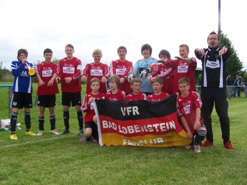 Riesen Jubel bei den C Junioren, Eltern und Fans nach dem Abpfiff beim 2. Relegationsspiel in Triptis. Nachdem man letzte Woche das erste Spiel gegen Hermsdorf mit 2:1 gewann, siegte das Team von Trainer René Richter erneut mit 2:1 und machte damit das Saisonziel "Landesklassenaufstieg" perfekt. Den besseren Anfang erwichte der Gastgeber. Sogar ein unberechtigter Elfermeter in 20 min konnte Triptis nicht nutzen. Der Triptiser Schütze scheiderte am überragenden VfR Keeper R. Steinbach, der auch im ganzen vor, wie auch letzte Woche gegen Hermsdorf, mehr als ein sicherer Rückhalt war. Danach wachte der VfR auf und erzielte in der 26 min das Führungstor durch Eugen Gergert. Das 2:0 für den VfR erzielte in der 58 min Eric Schrepel. Der Tritiser Anschlusstreffer zum 2:1 kurz vor Schluss war nur noch Ergebniskosmetik. Nach dem Schlusspfiff lagen sich alle freudestrahlend in den Armen. Dies ist für die C Junioren der 3 Aufstieg hintereinander in 3 Jahren.